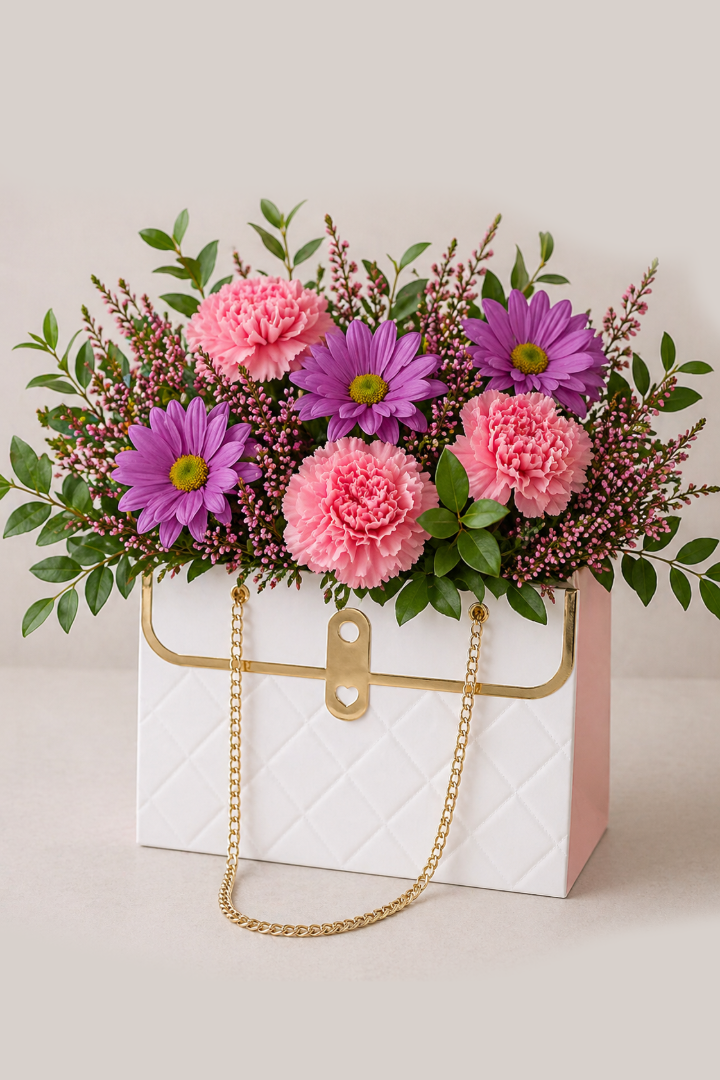 Presented in a chic white handbag-style gift box with gold detailing, this arrangement offers a modern and elegant twist on traditional flowers — making it both a stylish gift and a decorative keepsake.
