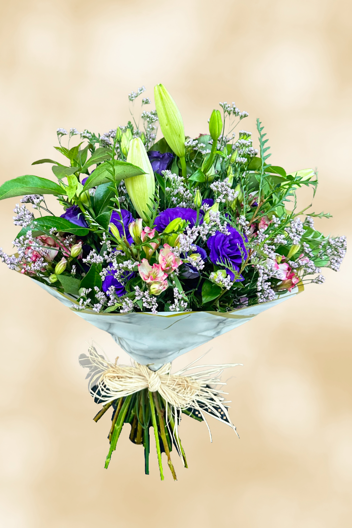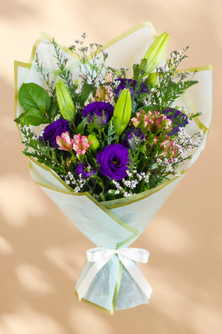 A graceful blend of elegance and natural beauty, The Serene Luxe Bouquet is thoughtfully arranged with a mix of soft florals and lush greenery. Featuring Greyvillea Ivanhoe, Viburnum, delicate Alstroemeria, airy Limonium latifolia, elegant Lilies, and romantic Lisianthus, this bouquet brings together texture, colour, and freshness in perfect harmony.